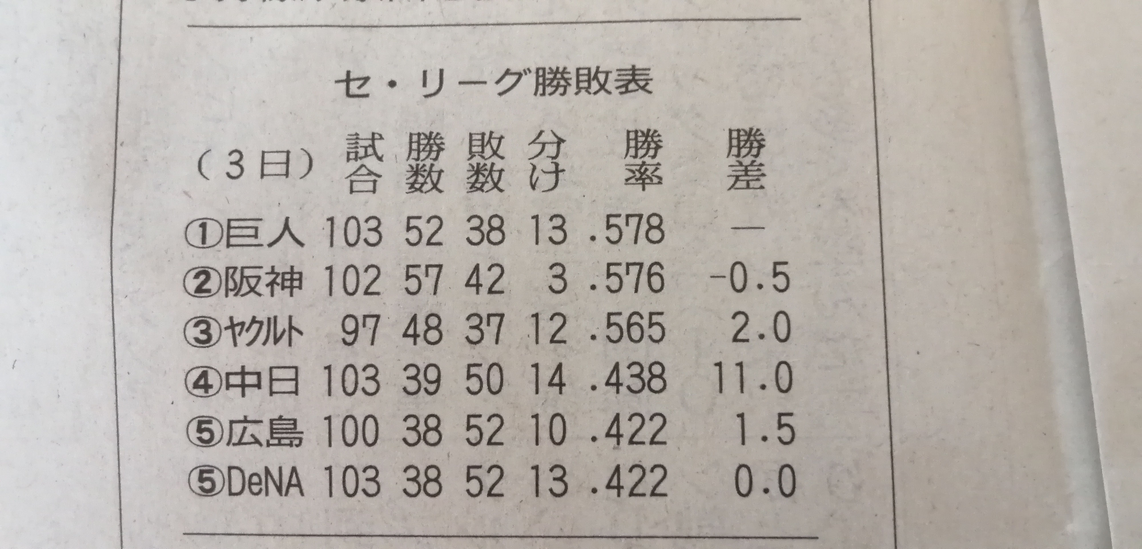 セ リーグ順位表 ゲーム差 0 5 の珍現象 プロ野球 スポーツ ニュース 読売新聞オンライン