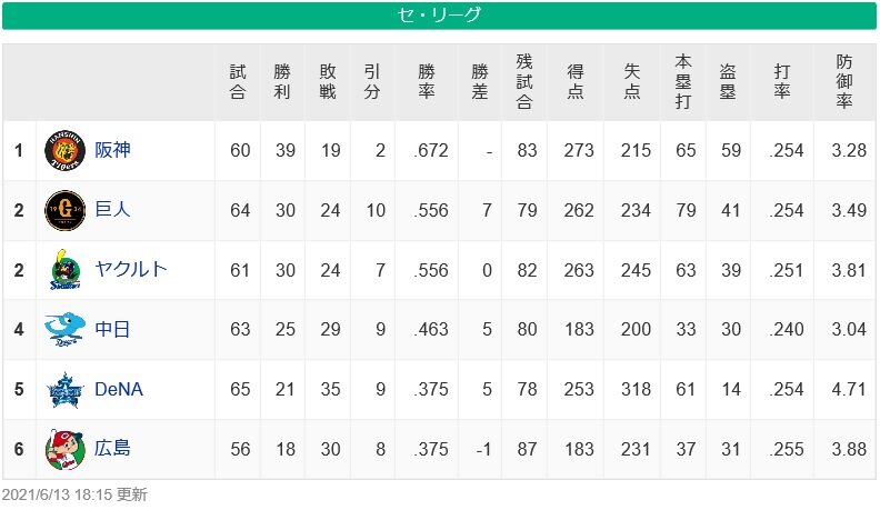 広島とついに1ゲーム差か と思いながら一球速 ゲーム差の話題 2021 6 13 日 18時頃 ツイ速クオリティ Twitter
